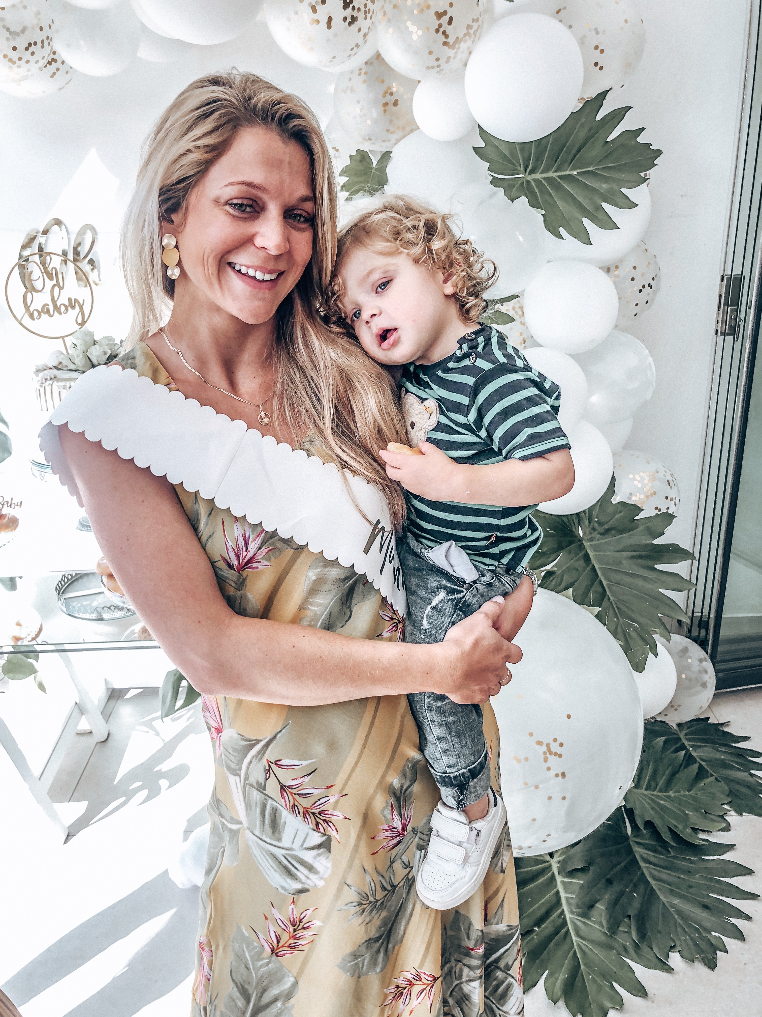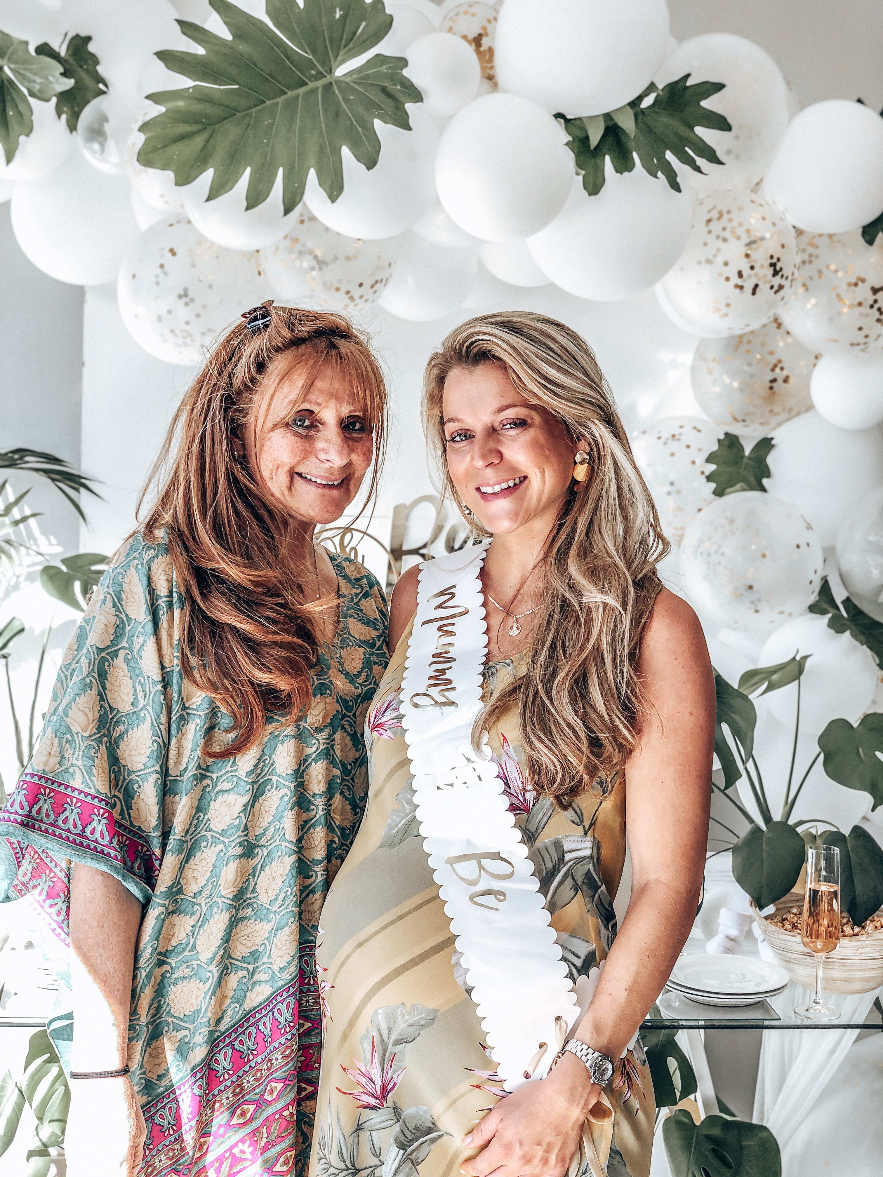 As Tashi is having another surprise we don’t know if its a little blue or pink bundled up in her perfectly round belly, and so we opted for a very classic white, gold and fresh green leaves look and feel.