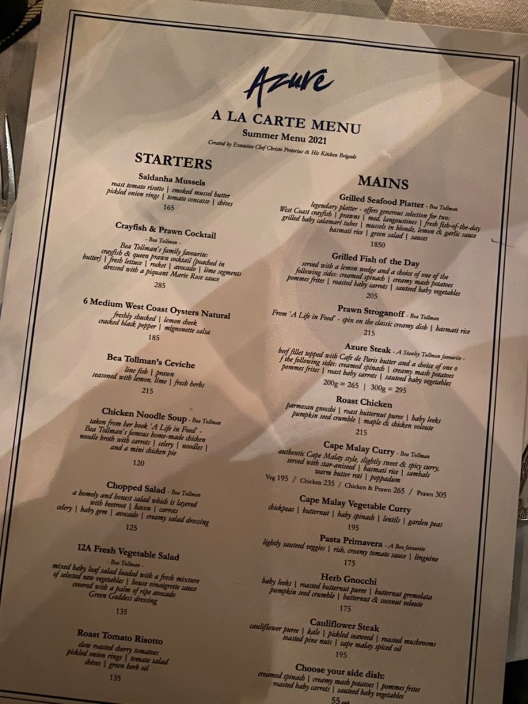 The breakfast room is something to behold. A selection of breakfast options beyond your wildest dreams, all laid out in tiny glass jars so as to be safe in these times, (Covid). The views of the ocean are mesmerising, and you are able to order just about anything off the ala carte menu too. The coffee is exceptional, but beware, the virgin Bloody Mary will potentially give you hairs on your chest!